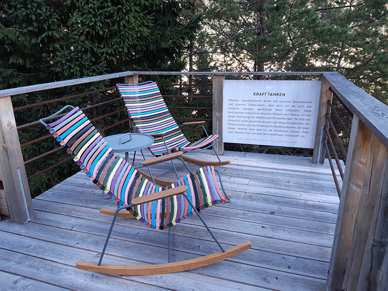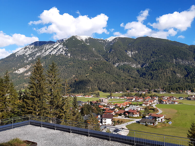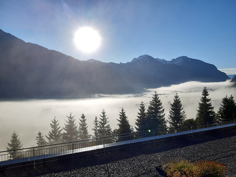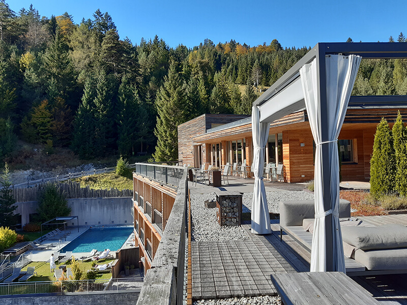 → Ein bissl in der Anlage umschaun, “Welcome Drink”, Nachmittagssonne und Ausblick auf Wald & Berge auf der Dachterrasse genießen.
