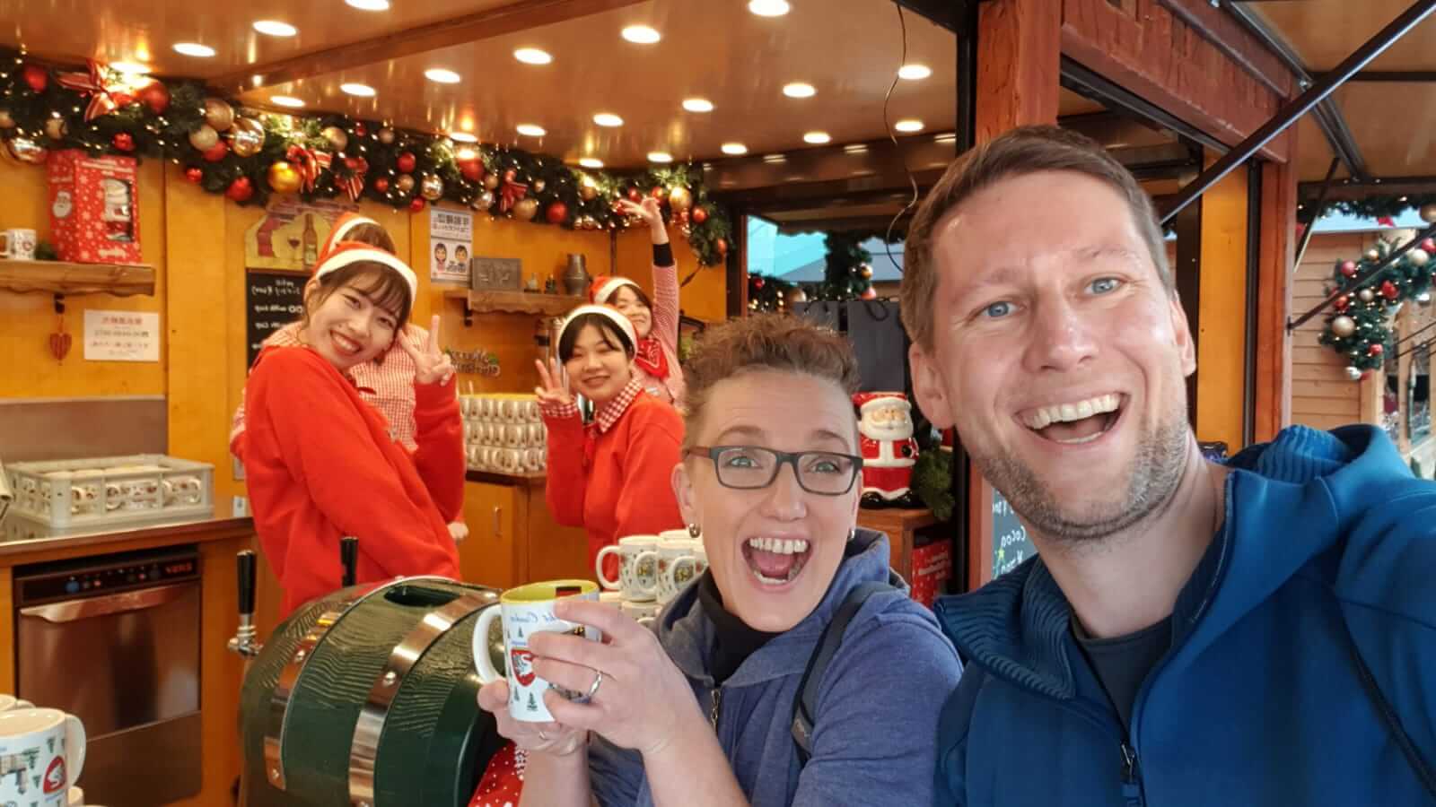 Zurück in Fukuoka stolperten wir am Bahnhof (Hakata Station) mal wieder in einen Weihnachtsmarkt. Diesmal zwar kein explizit “Deutscher”, aber Glühwein und Bratwürste gab es dort auch. Also gönnten wir uns Glühwein Nr. 2 in Japan, setzten uns an einen der zahlreichen Biertische und lauschten inmitten von hunderten Japanern dem dort gerade stattfindenden Konzert einer Teenie-Band. Eine etwas andere Christkindlmarkt-Erfahrung … war aber lustig und der Glühwein gut 😉