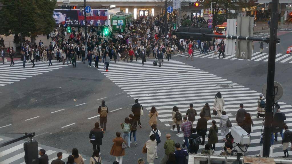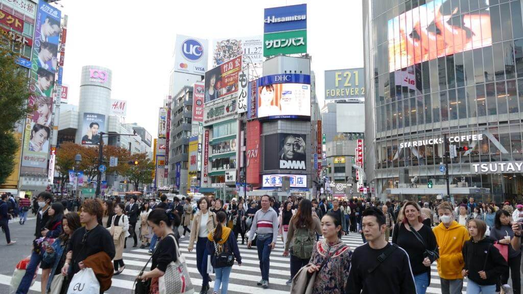 Hierbei handelt es sich um eine berühmte, überfüllte und dennoch (mittels 5 Zebrastreifen) sehr gut organisierte Kreuzung, die angeblich zu Stoßzeiten von 3.000 Menschen überquert wird. Nicht nur wegen des Gewusels, sondern auch wegen der vielen Hochhäuser mit Werbetafeln und Bildschirmen erinnert der Platz einen unwillkürlich ein wenig an den Times Square in New York.