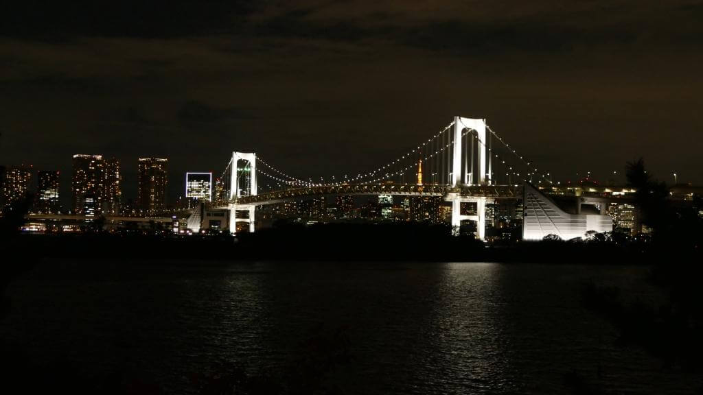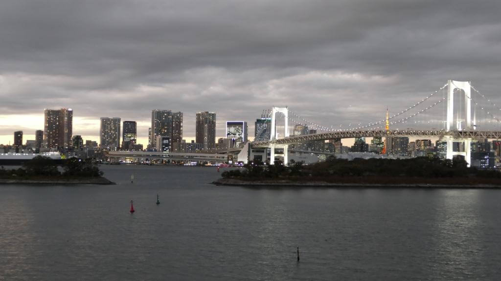 Frisch gestärkt ging es weiter in den Stadtteil Odaiba – natürlich per U-Bahn und wie meistens ca. 30 Minuten Fahrt. In diesem Teil Tokyo’s hat es mir ausgesprochen gut gefallen. Odaiba liegt auf einer künstlichen Insel und gilt als Shopping- und Unterhaltungsviertel. Besonders bekannt – und der Hauptgrund für uns dort hin zu fahren – sind die Rainbow Bridge (abends schön beleuchtet) und ein Nachbau der Freiheitsstatue.