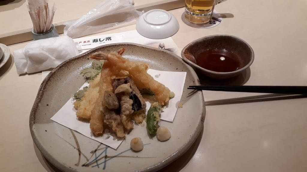 Abendessen: Gelandet sind wir diesmal im Edo Tokyo Sushitsune (Stadtteil: Oshiaga). Markus aß sehr gut und mit viel Liebe direkt vor unseren Augen zubereitetes Sushi und ich Tempura. Wir fanden es sehr lecker und außerdem faszinierend den Sushi-Chefs beim Zubereiten der Speisen zuzuschauen.