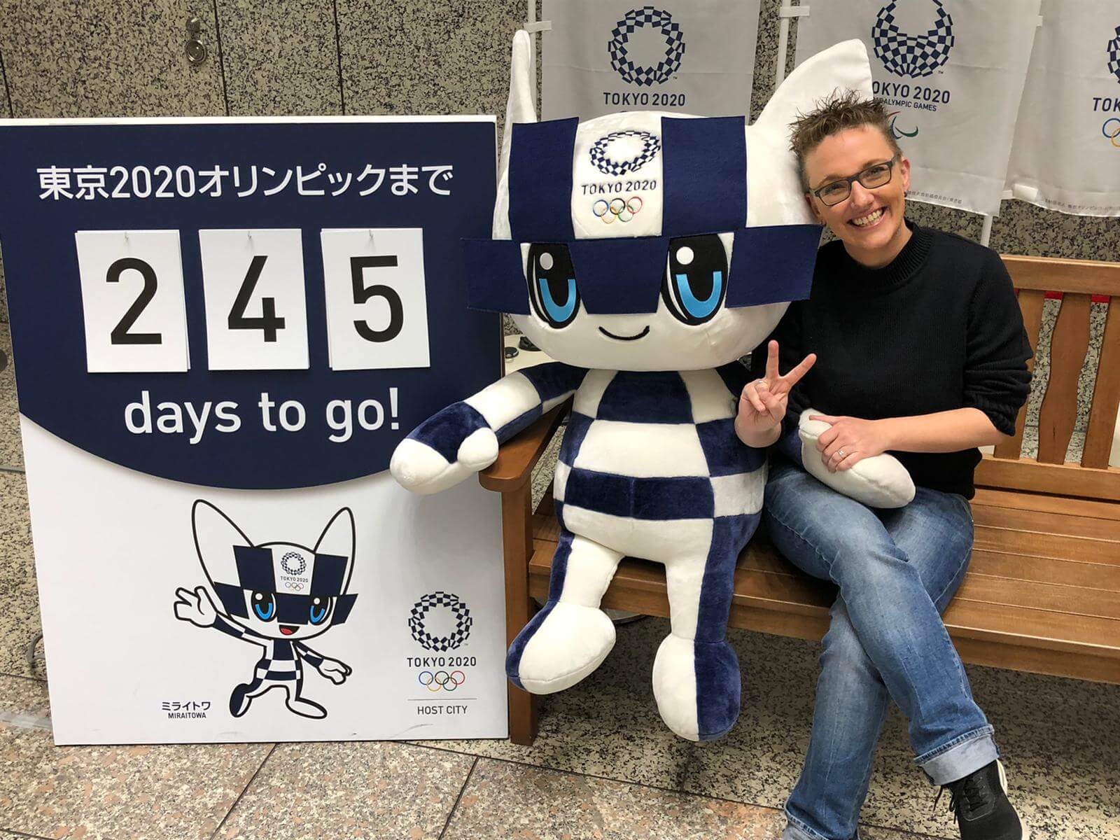Wir starteten mit einem gemütlichen, europäischen Frühstück (Croissants, French Toast und Milchkaffee) in einer französisch anmutenden Bäckerei nahe des Hotels. Von dort ging es per U-Bahn zum (diesmal geöffneten) Metropolitan Government Building und auf die dortige Aussichtsplattform. Gesehen haben wir aufgrund des Sauwetters zwar nichts, aber auf dem dort stehenden Klavier gaben junge Künstler ihr Können zum Besten, was sich durchaus hören lassen konnte. Wieder unten entdeckten wir noch eine kleine Ecke, in der die Flaggen und Maskottchen für die Olympischen Spiele 2020 in Tokyo ausgestellt wurden. Natürlich haben wir die Chance für ein kleines Fotoshooting genutzt.
