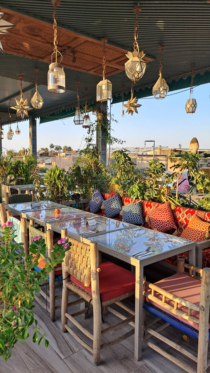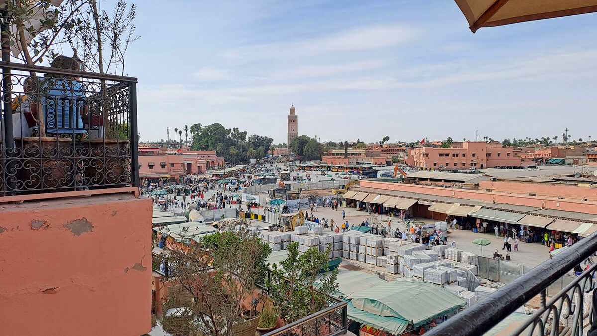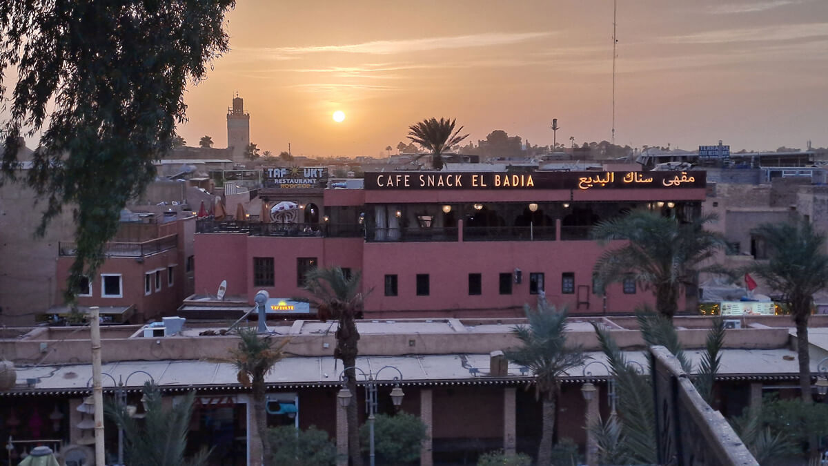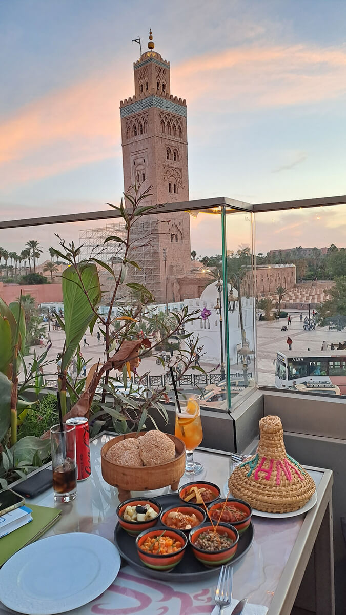 Tipp: Rund um den El Fna gibt es etliche Restaurants mit Dachterrasse und schönem Blick über den Platz. Cafe de France war OK, würde aber nicht unbedingt wieder hingehen – und das nicht nur, weil ich fast von einem Sonnenschirm erschlagen wurde 😉