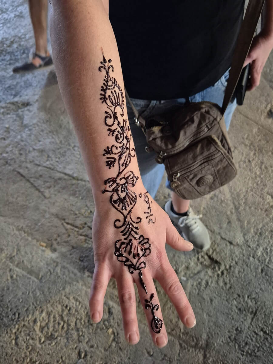 Nebenbei: Auf dem El Fna muss man wirklich auf der Hut sein. Waren wir auch und sind weder Taschendieben, noch Schlangenbeschörern oder Typen, die einem ihre Affen (oder andere Tiere) für ein Foto in die Arme zu drücken auf den Leim gegangen. Auf dem Rückweg zu unserem Riad, hat es mich dann aber doch erwischt :o( Schwuppdiwupp griff eine Henna-Malerin meinen Arm und pinselte ihn ungefragt in rasanter Geschwindigkeit und mit viel Gelaber vom Ellbogen bis zu den Fingerspitzen voll. Klar, ich hätte einfach meinen Arm wegziehen und gehen sollen, aber die Henna-Tante hat mich (und auch Markus) vollkommen überrumpelt. Am Ende des Tages wollte sie erstmal ca. 40€ für ihr Kunstwerk; schlußendlich bekam sie 15€. Immer noch zuviel, wenn ich bedenke, dass ich bereits am ersten Abend für den Rest des Urlaubs ungewollt “rebrandmarkt” wurde.