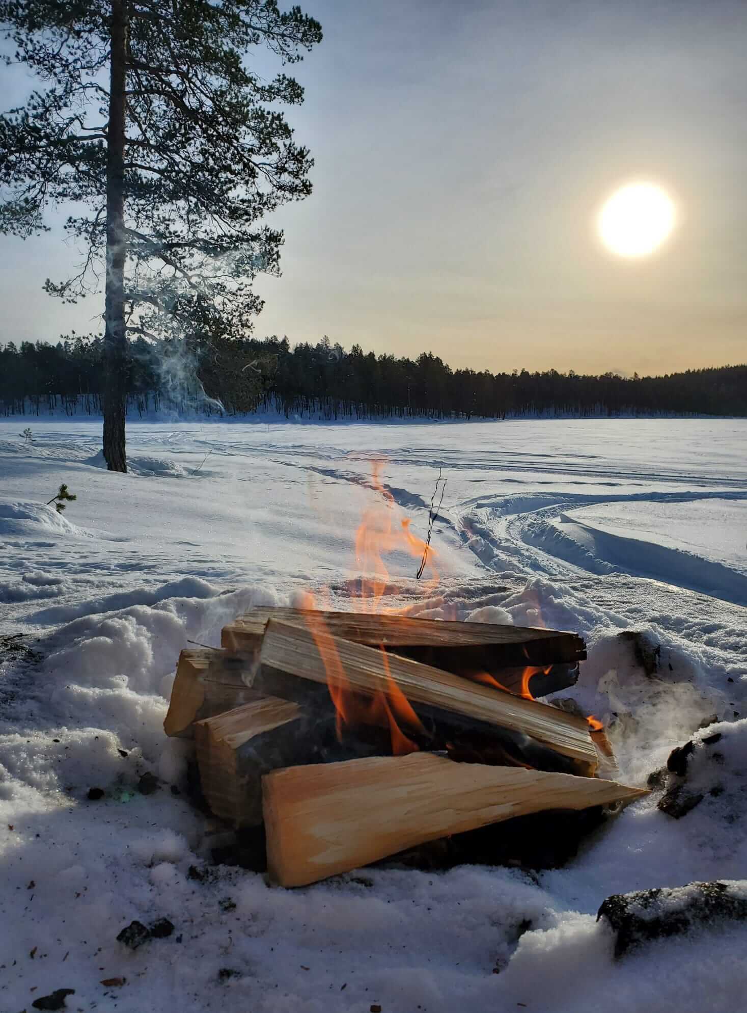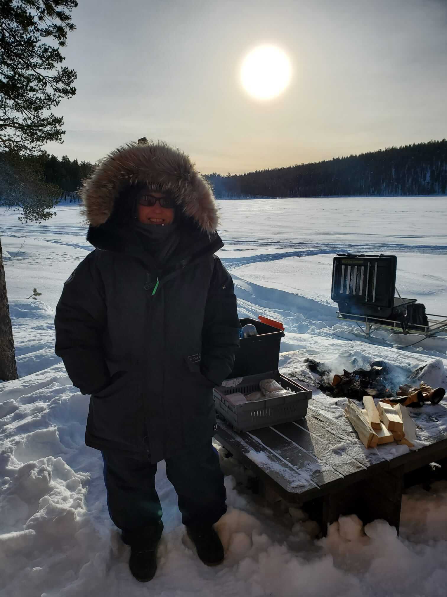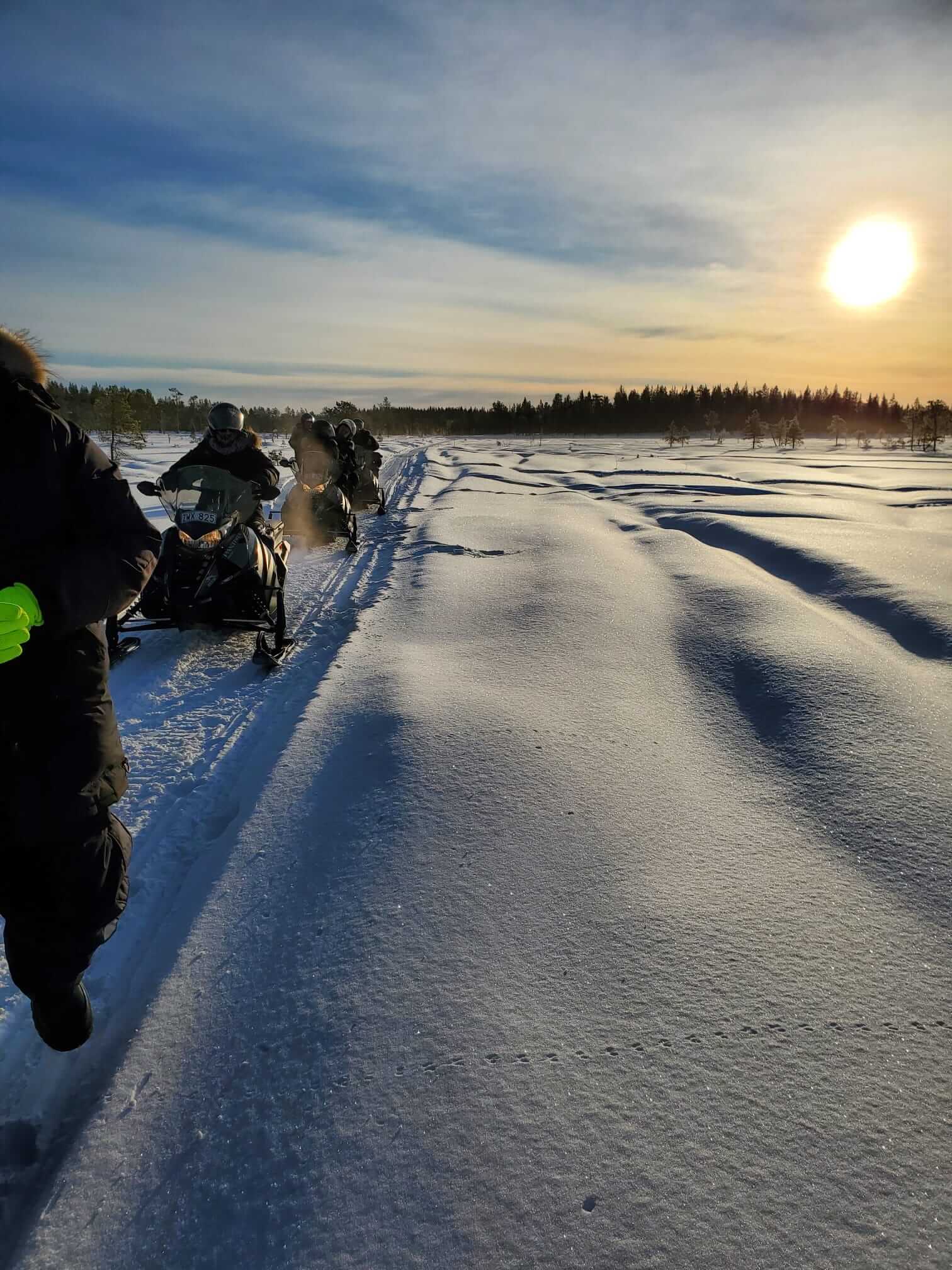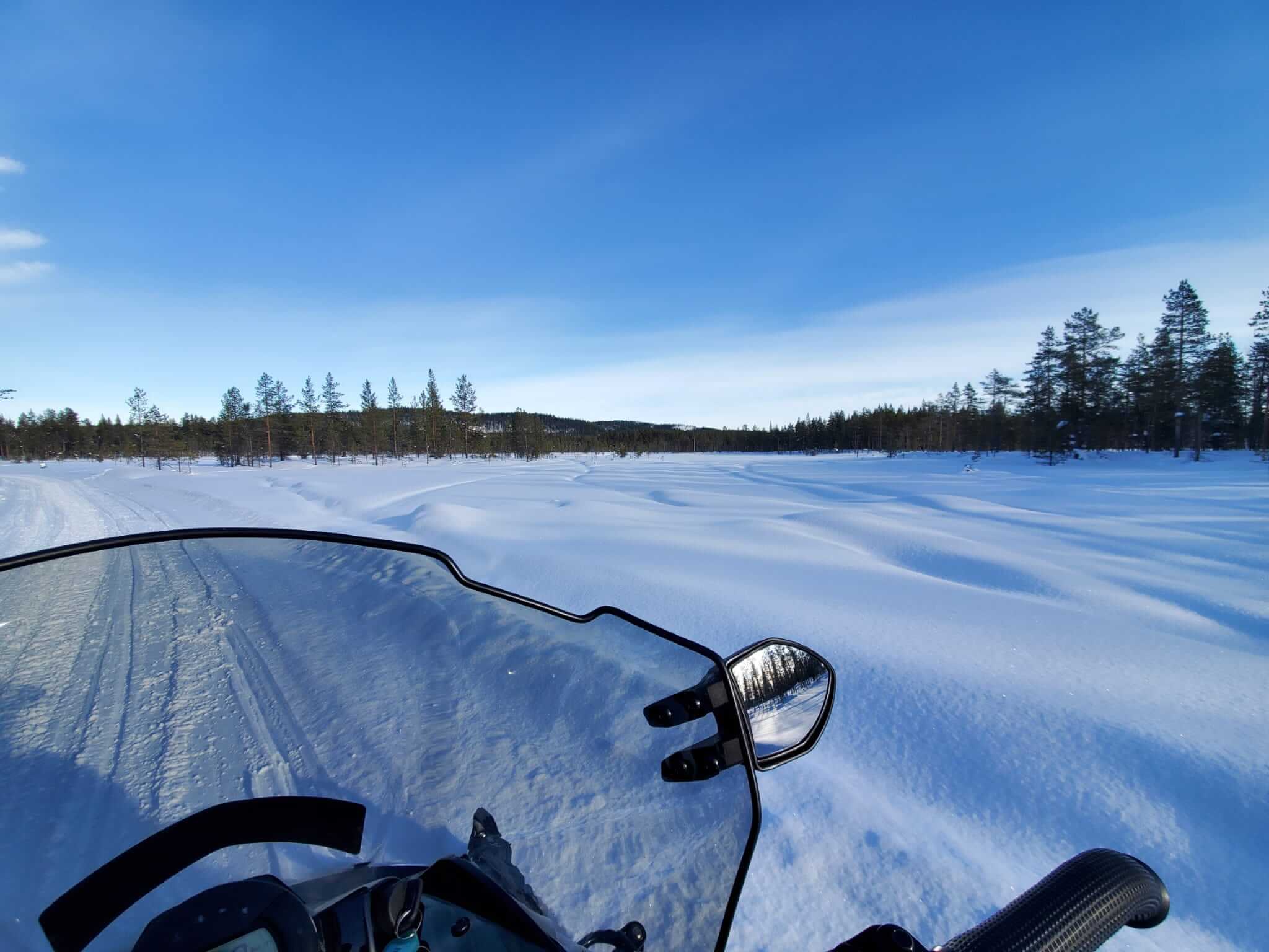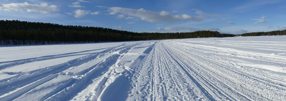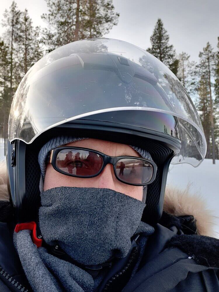 → 8:30 Uhr: Ab auf die 2-Personen Schneemobile und los! Da Monika schon beim Quadfahren in Namibia bewiesen hatte, dass ihr sowas mehr liegt als mir und sie dabei auch mehr Spaß hat als ich, habe ich es mir auf dem Rücksitz gemütlich gemacht und die ca. 3,5-stündige Fahrt durch die Schneelandschaft einfach nur genossen. Dummerweise hat mein Handy aufgrund der Kälte ausgerechnet an unserem wirklich superschönen Rastplatz kurzfristig schlapp gemacht. Danke nochmal an Monika für die Fotos und den Tipp, das Handy aus der Lederhülle zu nehmen und näher am Körper zu tragen!