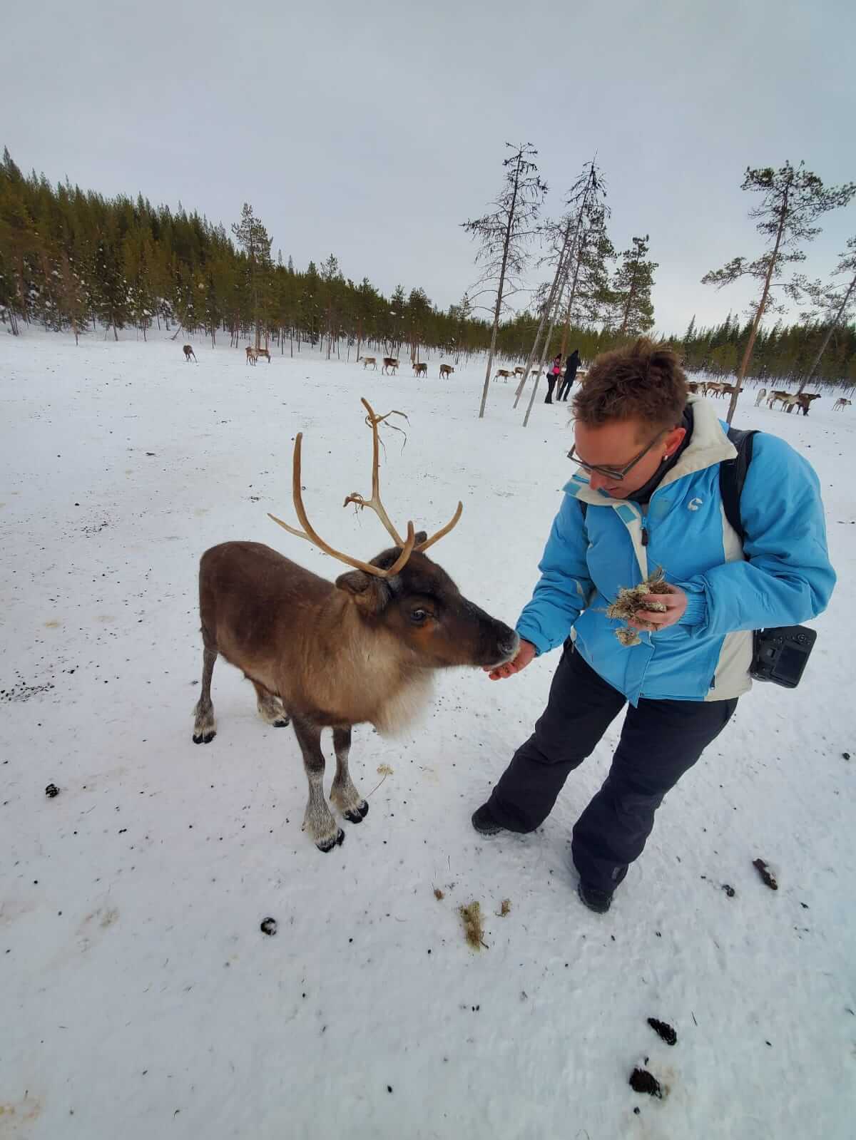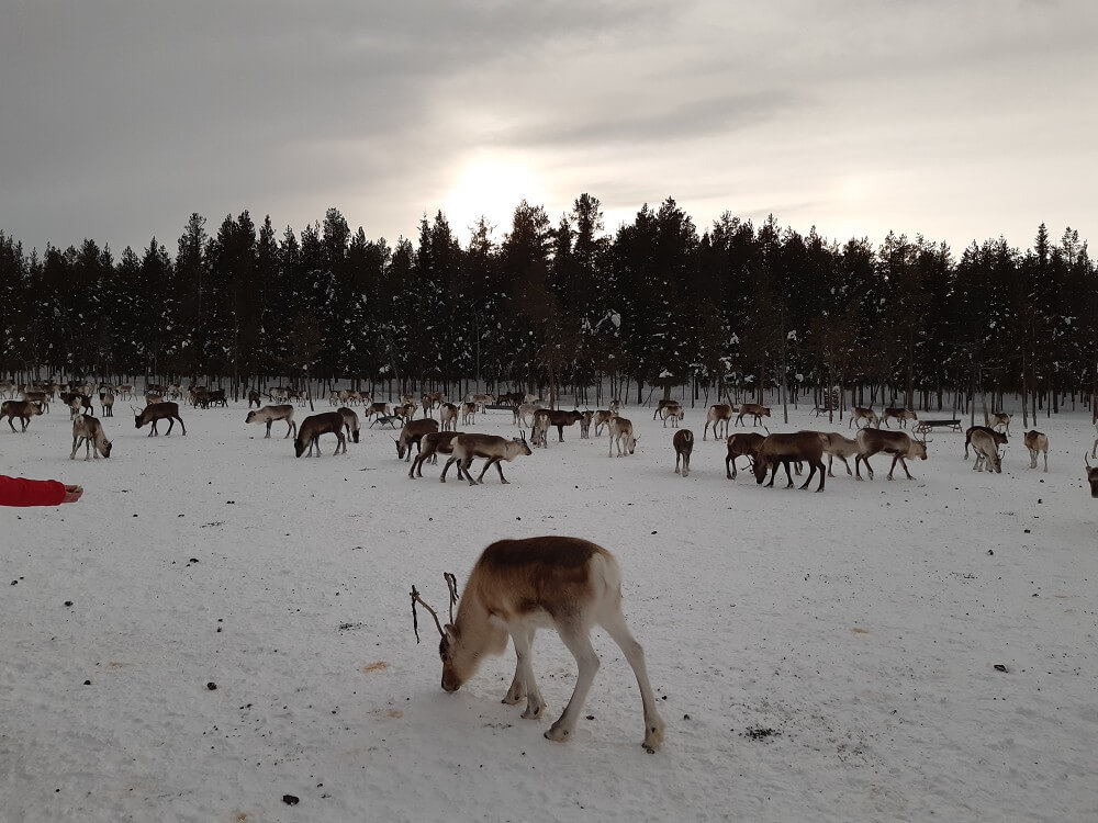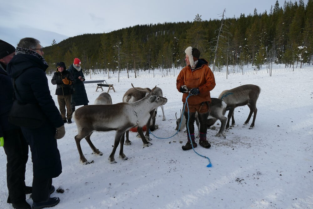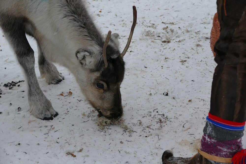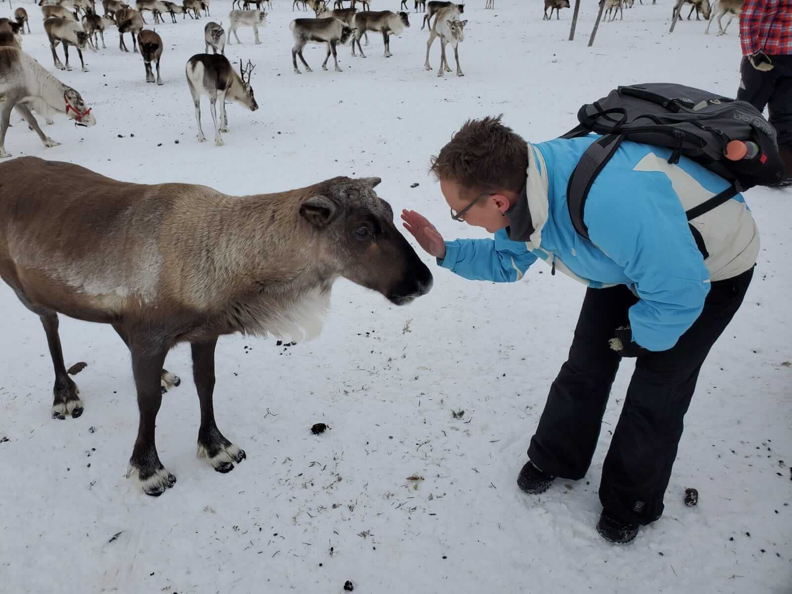 → 13:00 Uhr: Abfahrt zur Rentierfarm. Hier haben wir viel über Rentiere an sich gelernt und konnten sie füttern und streicheln (sind flauschig und warm!). Außerdem haben uns Helena und ihr Bruder, denen die Rentierherde gehört, berichtet wie sie als Samen (indigenes Volk) so mit und von den Rentieren leben. Abschließend gab es dann noch Tee und einen (sehr leckeren) Rentier-Kebab mit Beerensauce.